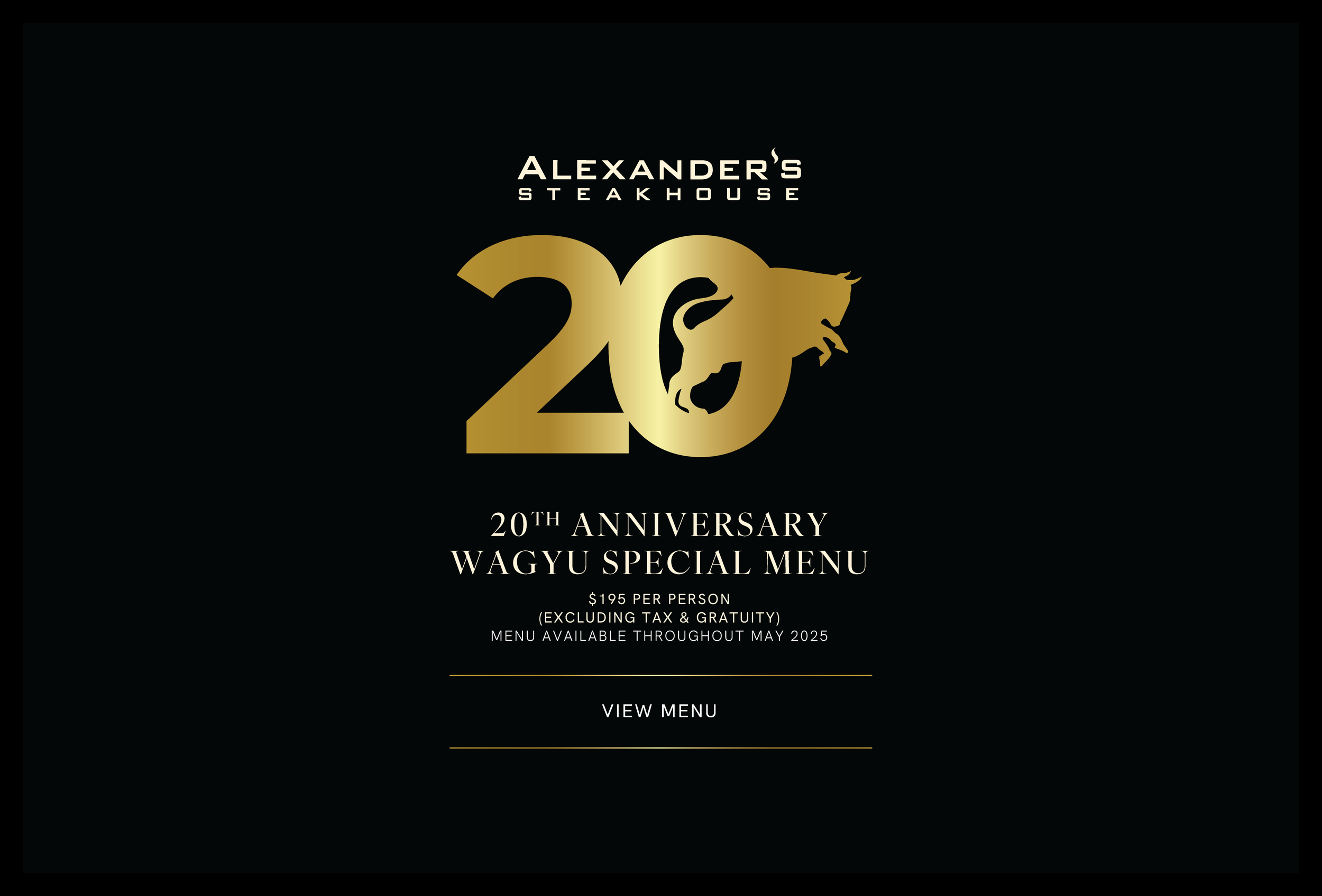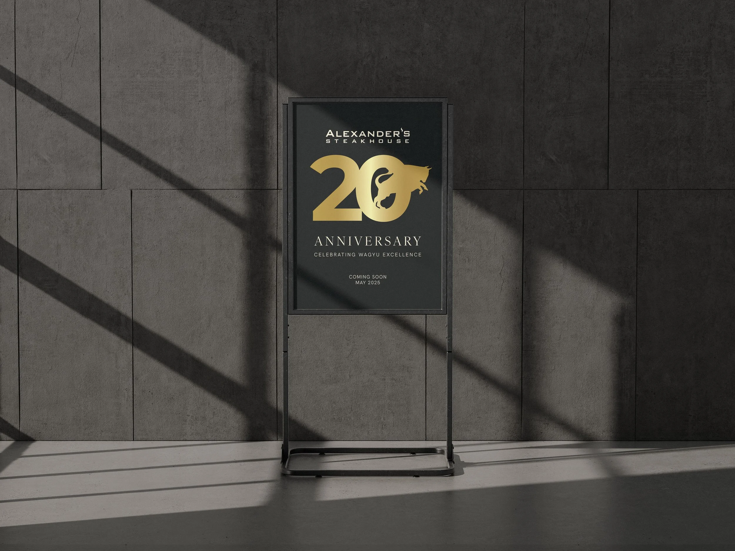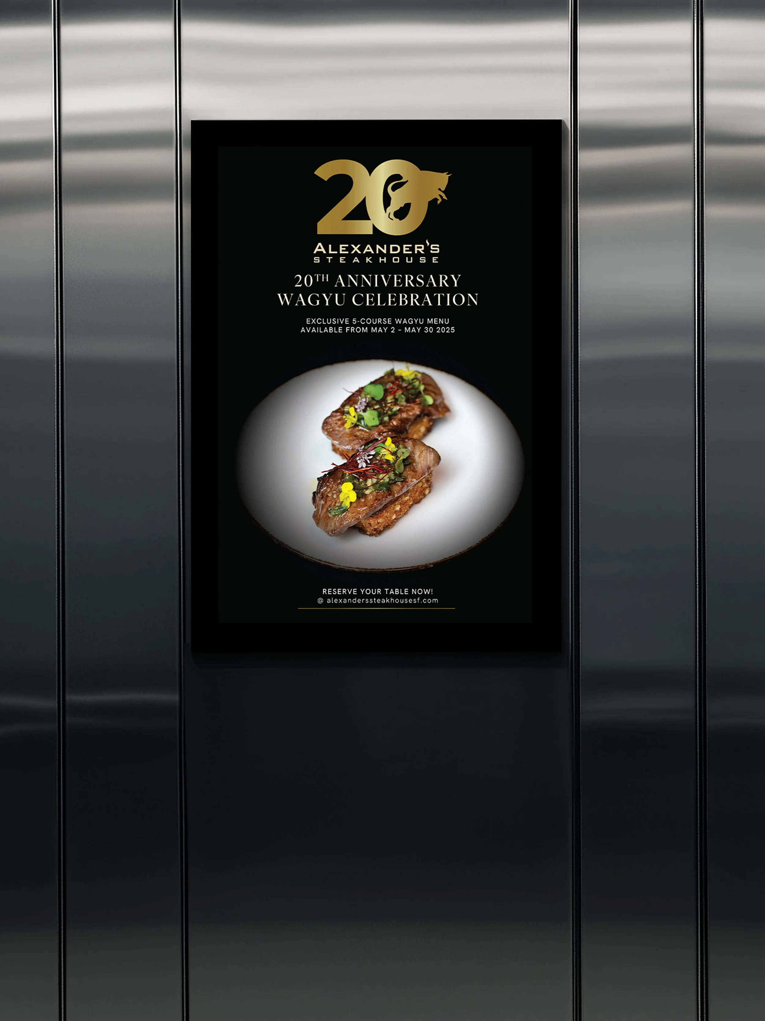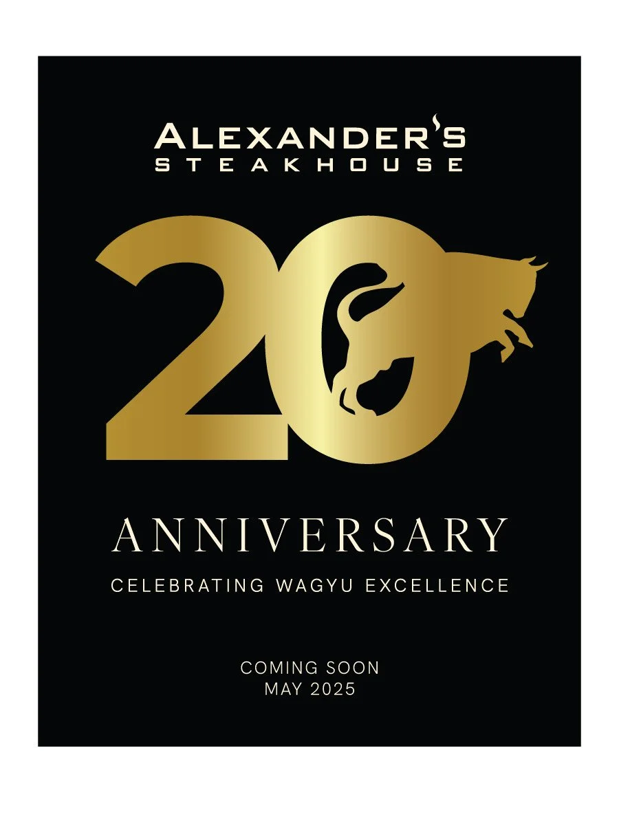 Description — To celebrate Alexander’s Steakhouse’s 20th year, I designed a commemorative logo that incorporated our brand icon with the number “20,” centered around the theme of Wagyu Excellence. This branding carried through a full campaign: