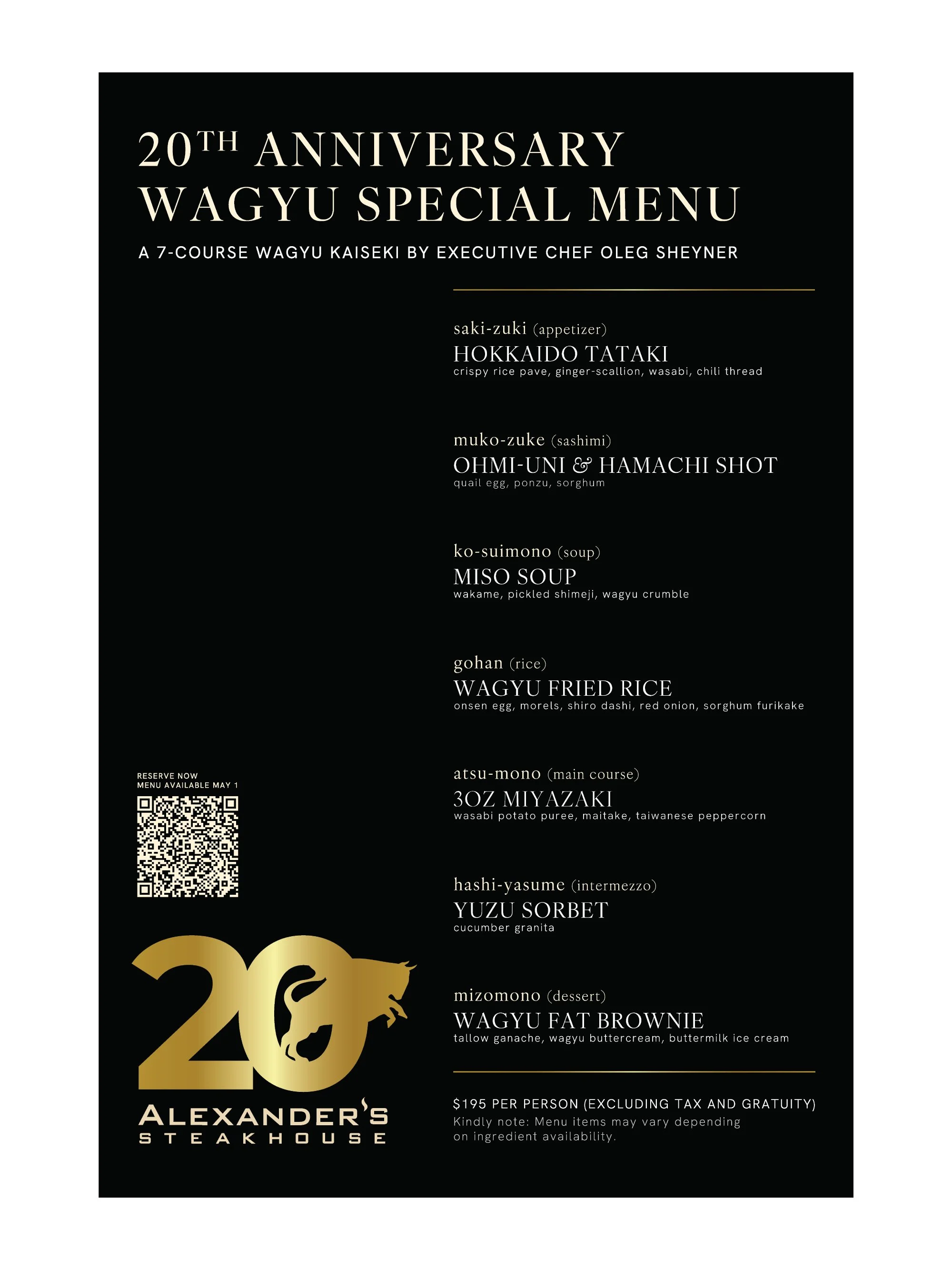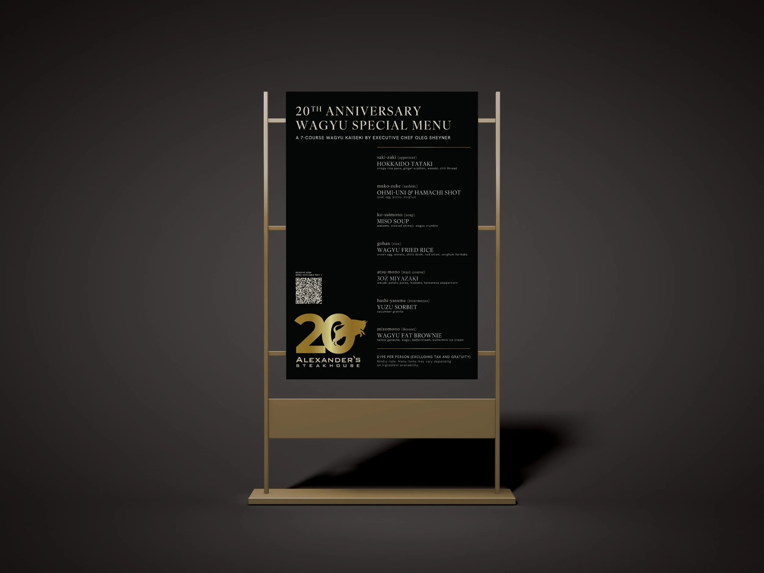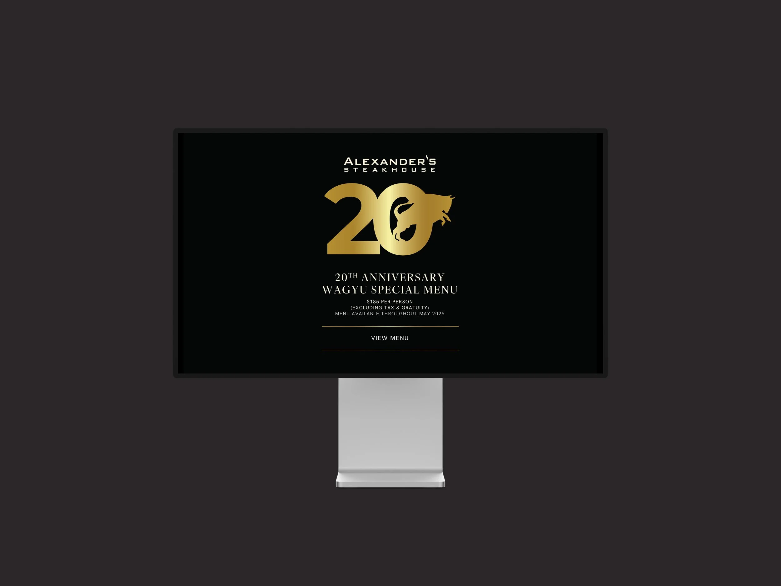 Description — To celebrate Alexander’s Steakhouse’s 20th year, I designed a commemorative logo that incorporated our brand icon with the number “20,” centered around the theme of Wagyu Excellence. This branding carried through a full campaign: